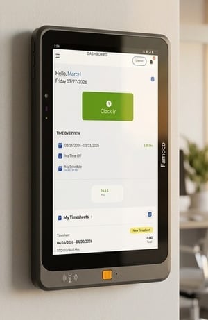 The Shared Time Clock uses a durable 10-inch tablet from Famoco, specifically engineered for tough environments. It enables a secure clock-in process by automatically capturing a photo at every login, which helps prevent "buddy punching" and makes attendance records more reliable.